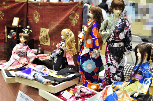沢山の方に来ていただいて、ほぼ完売で帰ることが出来ました。ありがとうございます。上の写真が販売開始早々の状態。いつも着せては売り着せては売り…を繰り返し、着物の色柄によってヘッドやドールの配置を変えたりするので、来る度に何かが違うブースになってます(笑)