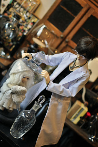 今回のスタジオはアンティークショップを兼ねた所で、何やら色んな物がわさわさ積んであるような雑多な感じが面白い所でした。「このスタジオどうかな?」って連絡もらった時に「いい!すごくいい!イメージわく!」て私が言ったんだけど、その時わいたイメージが白衣だったんだ。研究室っぽく見えたんだもん。で、白衣祭りじゃ〜って言ってスタジオ行ったら、貴族服で行った方が良い所だった(笑)まぁ、服装間違えたね!って言いつつも、白衣しか無いから強行したんだが…。でも面白かったよ、ギャップが。こういう、ゴチャゴチャした所大好きだよ!(背景考えないでいいからネ)